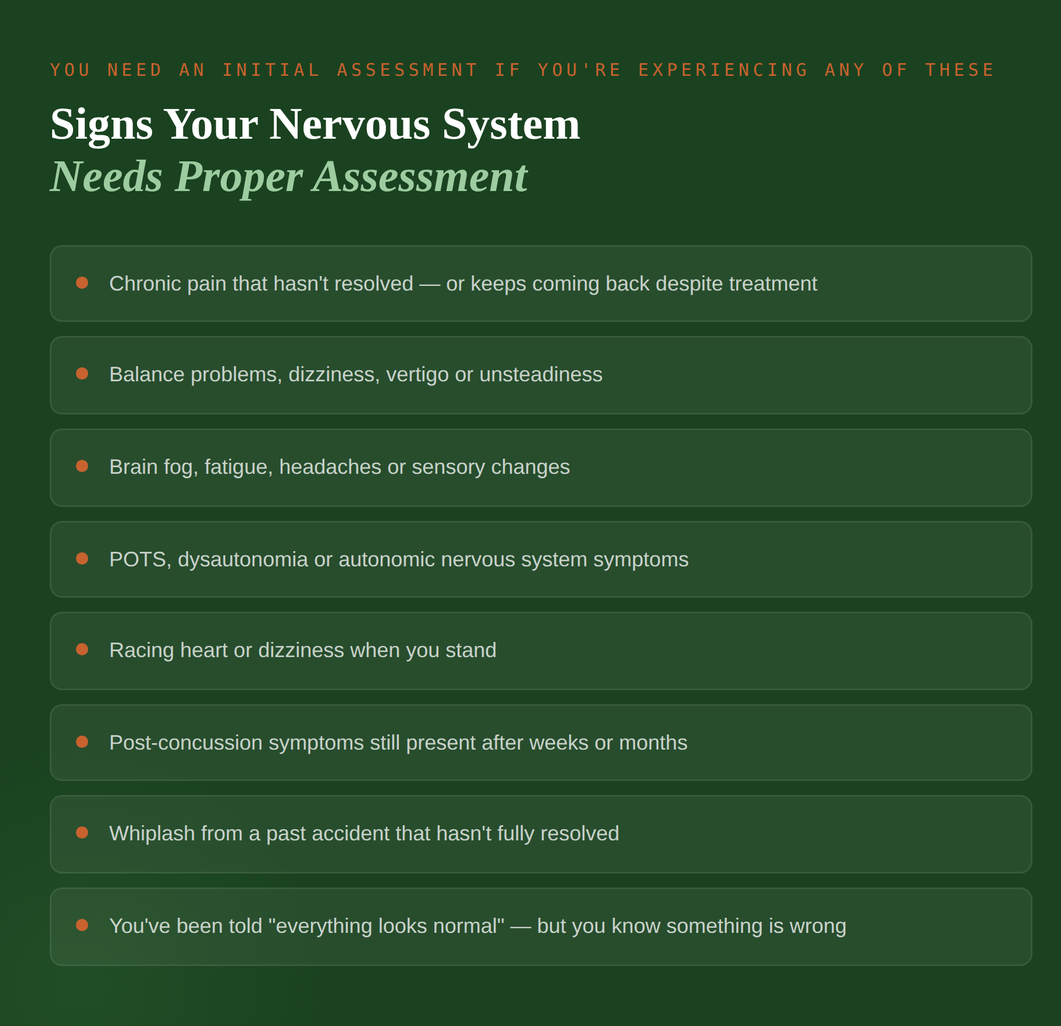 I use this approach across a wide range of presentations, from acute post-concussion recovery through to complex chronic conditions like POTS and dysautonomia, where the autonomic nervous system's failure to regulate basic functions is often rooted in exactly this kind of neurological miscommunication.
