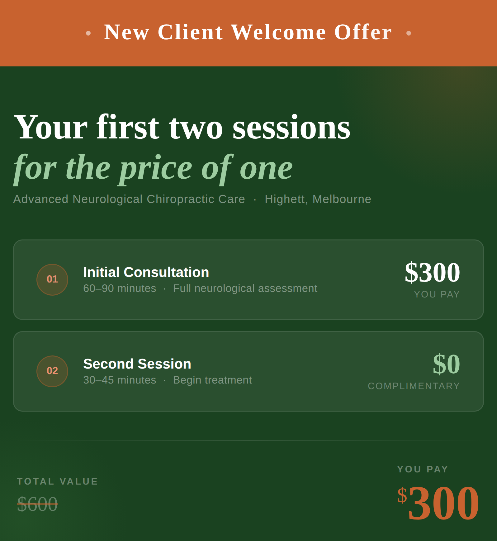 You will leave knowing exactly what is going on, what has been driving your symptoms, what needs to happen and a realistic timeline for getting there. I will put together a personalised care plan that evolves as you progress and we will shape it together so it actually fits your life. You are a real person and in my sessions you will be treated as such. The reason my clients get results where others don't is the time I take, the way I listen and the care I bring to really feeling into your experience. That is what allows me to get to the actual problem and help you make changes that last.