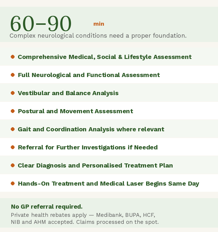 My Brain First approach changes the starting point. Rather than beginning with your symptom and working backwards, I start by assessing how your nervous system is actually functioning, which pathways are underperforming, which systems are compensating, and where the breakdown in brain-body communication is occurring. This requires a different kind of assessment, one that goes beyond X-rays and orthopaedic testing to include neurological, balance, vestibular and movement analysis.